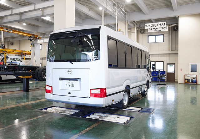 トラックやバスなど大型車の車検に係わるスピード・メータ誤差やブレーキの制動力、ヘッド・ライト光軸、サイドスリップ等に関する検査が行えます。