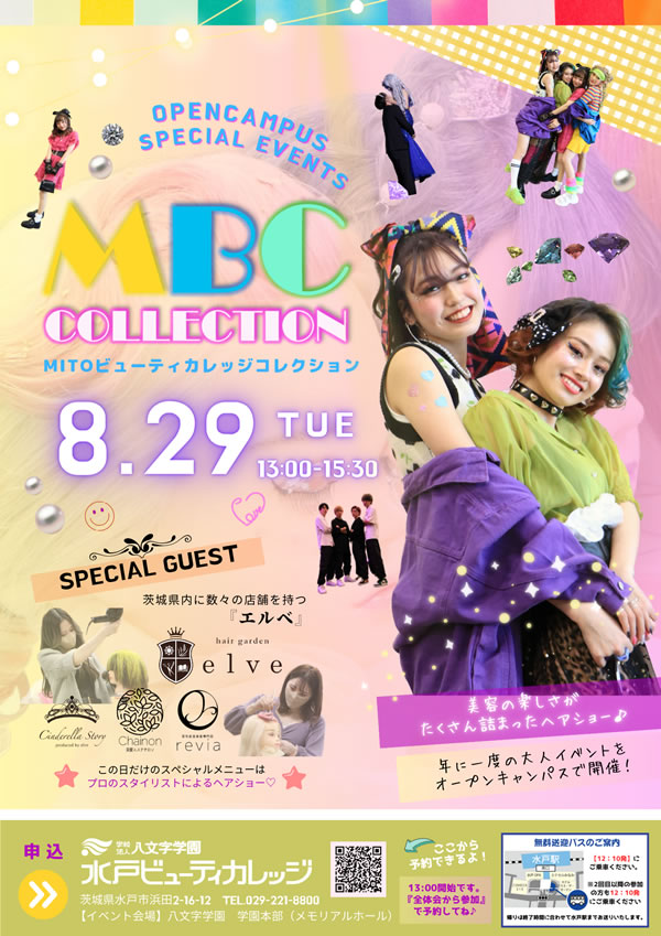 8/29(火)のオープンキャンパスでは【スペシャルイベントMBCコレクション】を開催します♥当日は、県内の美容室とコラボしてのヘアショーを行います。在校生とプロのスタイリストのステージをぜひご覧ください♪
