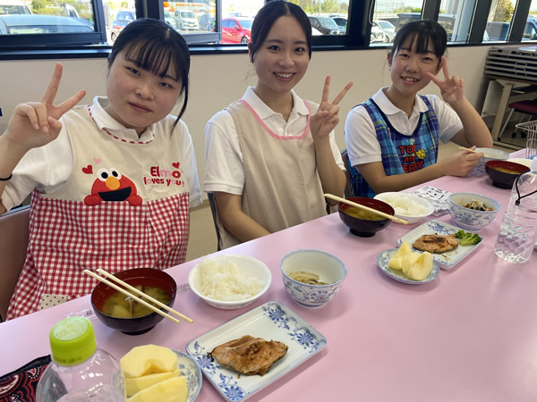 献立はご飯とマスの幽庵焼き・切り干し大根とさつまいもの味噌汁・りんごで、みんな減塩具合いなどを味わいながらも笑顔で実食していました。今後も多彩な実践を通して学びを積み重ねて、看護師の夢に向かっていきます。