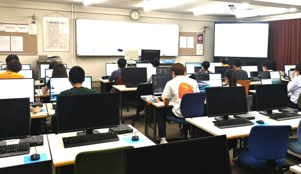 翌日7月19日(金)には、株式会社NESI様が作成したC言語のプログラミング課題に取り組む実習授業を行いました。学生たちは、日頃のスキルアップの成果を発揮すべく、一生懸命取り組んでいました。教員一同、良い結果を期待しています!