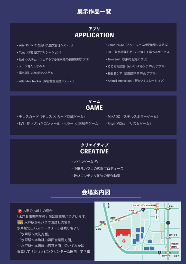 - クリエイティブ:動画、グラフィックデザイン等の作品展示