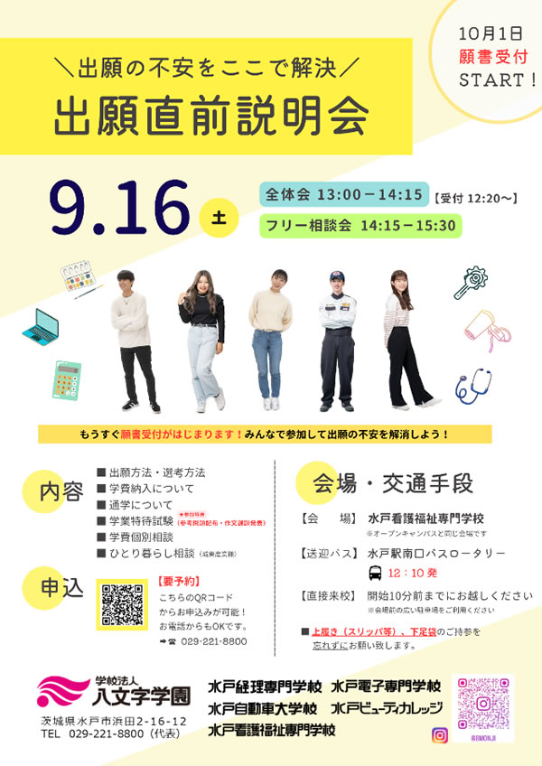 2023.08.01(火) 9/16(土)出願直前説明会を開催致します 10月1日より出願受付が開始致します!出願に当たっての不安は、出願直前説明会で解消しよう!!説明会の後は、フリー相談会を実施! 学校生活(授業や資格など)について 進学費用について 一人暮らしについて(不動産会社様が来てくれます★) など、お気軽にご相談いただけるお時間もご用意しております(^^) 出願直前説明会【専用申込フォーム】
