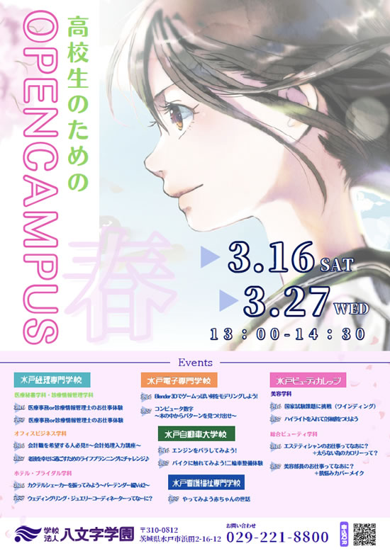 2024.01.16(火) 高校1・2年生のための春のオープンキャンパス! 高校1・2年生の春休みにおすすめのサマーオープンキャンパス!通常のオープンキャンパス開催よりちょっとショートタイムでお届け♪ 【対象校】水戸経理・水戸電子・水戸自動車・水戸ビューティ・水戸看護福祉 【開催日】3月16日(土)13:00~14:30 3月27日(水)13:00~14:30 ★水戸看護福祉はこちらのみ開催 【送迎バス】水戸駅南口 12:10発 →お申込み専用フォームはこちら